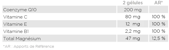 Apporte du Coenzyme Q10 ou Ubiquinone, anti-oxydant présent dans toutes nos cellules.